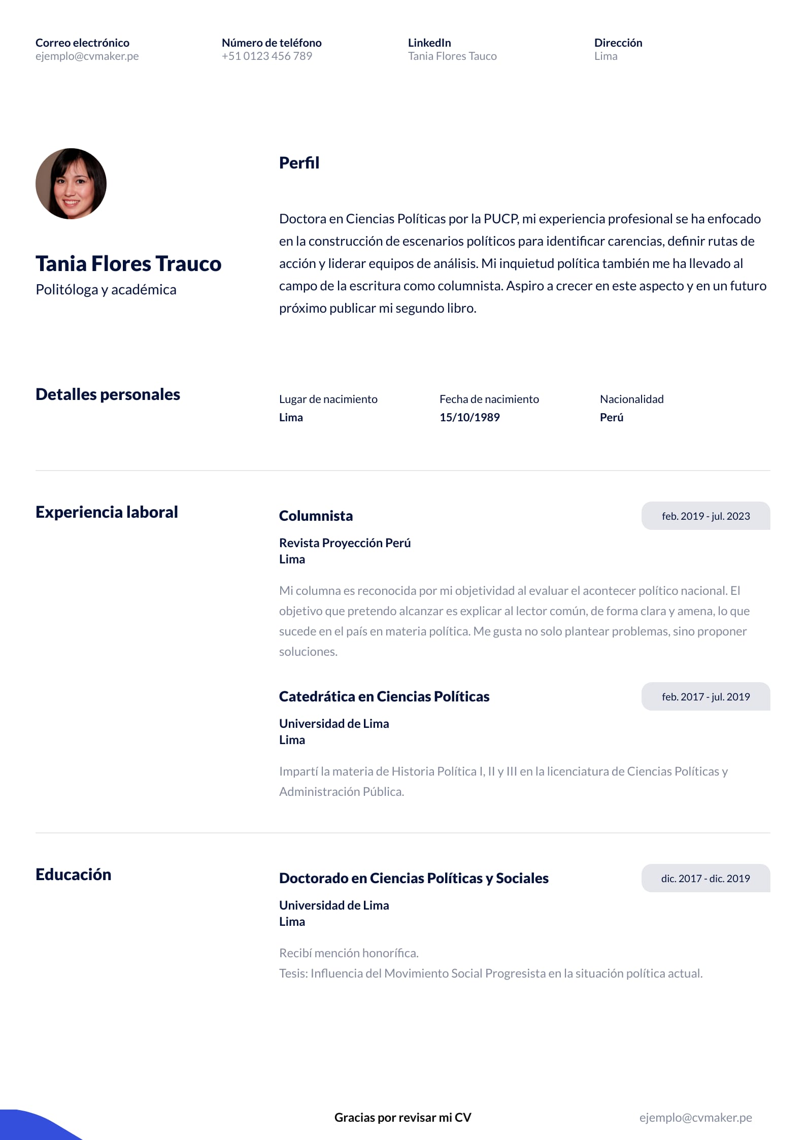 Un currículum vitae académico y profesional es el lugar perfecto para demostrar tus habilidades de comunicación y redacción: procura que este sea claro y conciso. Selecciona una plantilla de currículum que refleje profesionalismo y seriedad. Considera tener un CV base con tu experiencia profesional, formación y una lista de logros alcanzados, y personalizarlo cuando lo entregues a alguna persona o institución. Por último, recuerda que no solo es importante mencionar qué has hecho, sino los efectos que esto ha tenido en la comunidad académica y en tu campo de estudio.